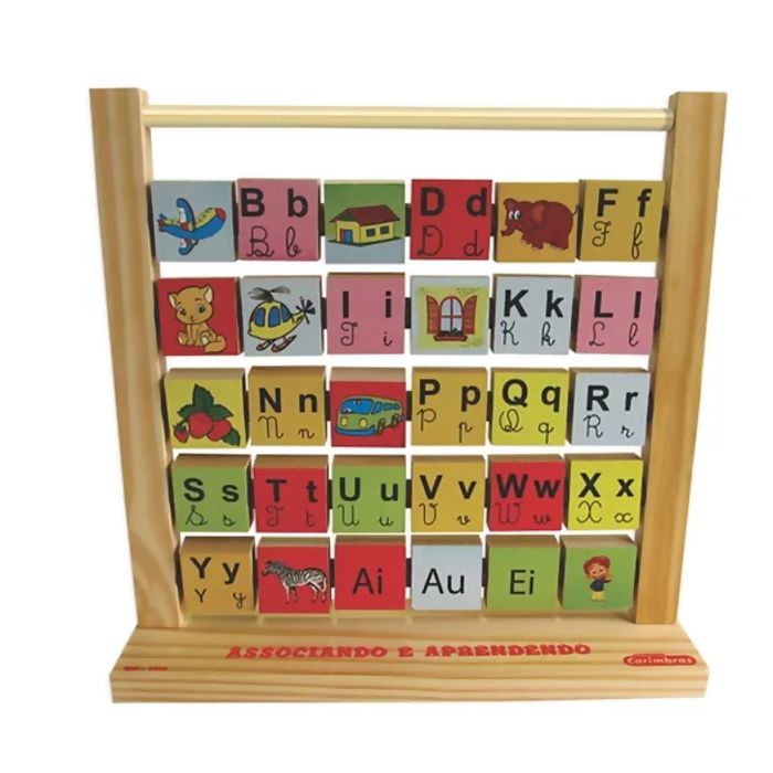 Descrição ASSOCIANDO E APRENDENDO ALFABETO ILUSTRADO GIRATÓRIO EM MADEIRA Carimbrás
