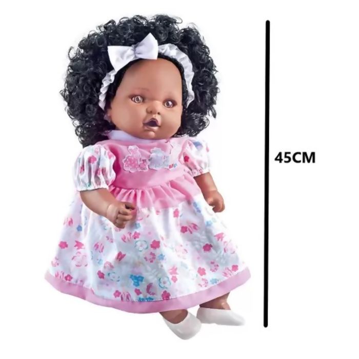 BONECA INFANTIL ANGELINA NEGRA ELA FALA 62 FRASES, COM UM VESTIDO LINDO DE PANO FEITA EM 100% VINIL, ACOMPANHA MAMADEIRA MAGICA QUE SOME O LIQUIDO DE DENTRO.