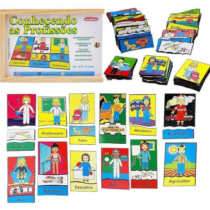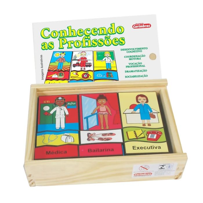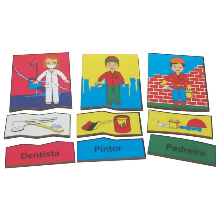 Com 72 peças em MDF que formam 24 conjuntos, as crianças podem descobrir diferentes profissões, seus instrumentos de trabalho e suas nominações.