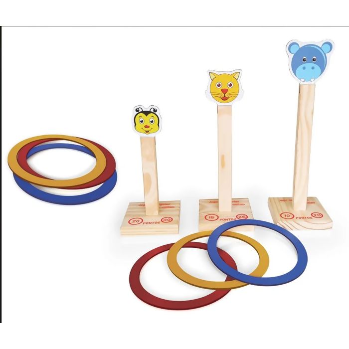 3 bases madeira medindo 100mm X 100mm X 18mm, cada, com orifícios para encaixar cada haste. 3 hastes em tamanhos variados com ilustração representativa de animais e 6 argolas em MDF de 2,5mm de espessura, sendo 3 com diâmetro de 175mm e 3 com 145mm em cores variadas.