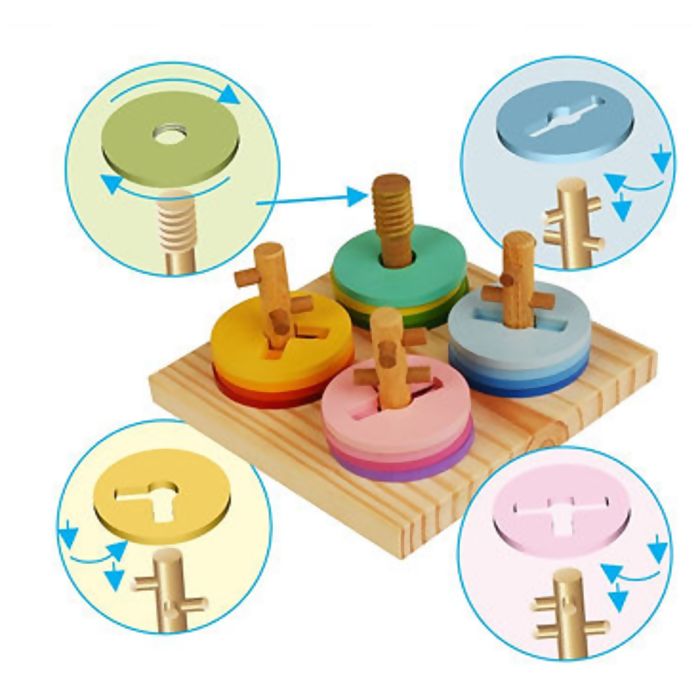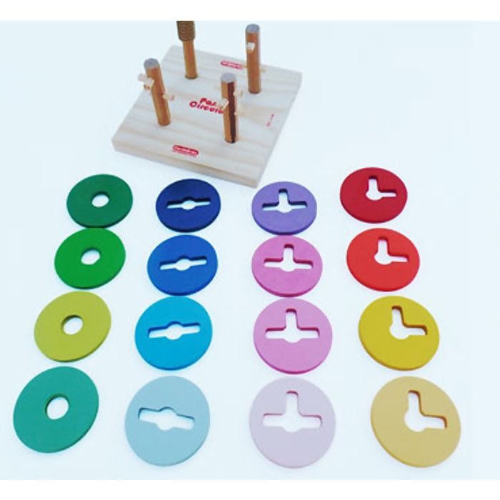 Este jogo tem como objetivo trabalhar a coordenação bimanual, coordenação motora fina (montagem e encaixe), proporcionando a descoberta através da ação exploratória. Trabalha também a amplitude espacial, ordem e simbologia. Explora a intencionalidade quando da passagem dos círculos.