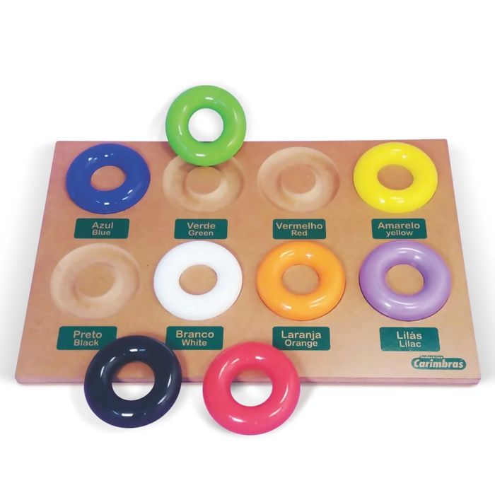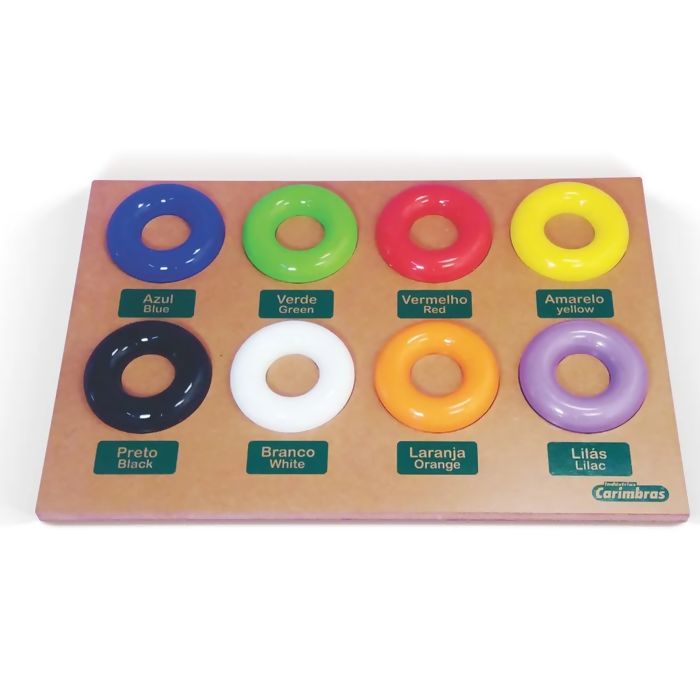 Contém: 08 argolas coloridas e cavidades que encaixam as argolas.