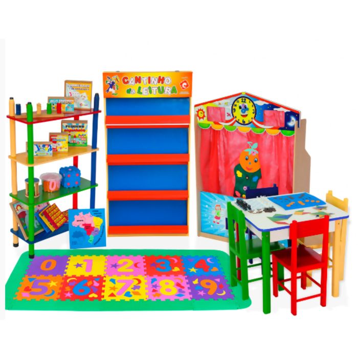 Descritivo detalhado: Brinquedoteca composta por 21 ítens: Teatro da hora, Mesa com 4 cadeiras, Pequeno engenheiro, Cantinho da leitura, tapete numerais com bordas, Prateleira colorida, Mapa, Fantoche avulso, Tangram, Memória, Dominó, Quebra-cabeça, Dado pequeno, Loto leitura, Numerais e quantidades, Fazendo cálculos, Jogo de xadrez e dama, Alfabeto móvel, Jogo de trilha, Ábaco aberto e Rola rola mini. Embalagem: Caixa de papelão