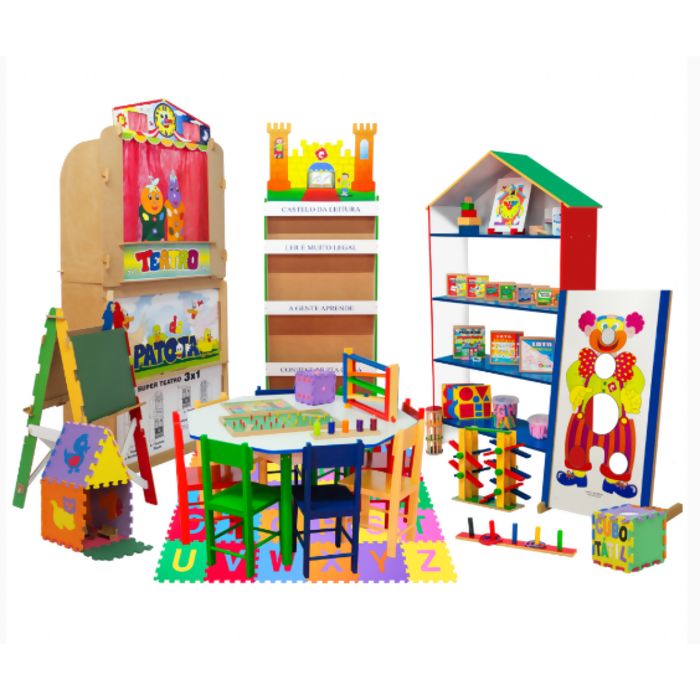 Descritivo detalhado: Brinquedoteca Master Brinquedoteca composta por 34 itens: Prateleira com telhado, Teatro da patota, Castelo da leitura, Tapete alfanumérico, Casinha de boneca, Móveis para casinha, Palhaço bola, Cubo tátil, Jogo de argolas liso, Bate martelo, Blocos lógicos de E.V.A., Ábaco, Quadro de atividades, Dominó adição, Dominó subtração, Dominó multiplicação, Dominó divisão, Futebol de pinos, Relógio cuco, Loto leitura, Loto numérica, Pote com 72 letras E.V.A., Pote com 40 números E.V.A., Memória alfabetização, Memória numerais e quantidade, Mesa oitavada com oito cadeiras, 2 fantoches, Quebra-cabeça de E.V.A., Pequeno engenheiro, Caixas coloridas, Dado grande, Rola-rola, Equilibrando 2x2 e Corrida fixa. Embalagem: Caixa de papelão. 3 anos