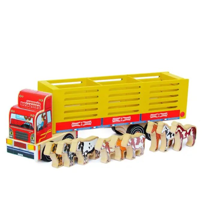 01 caminhão (Cavalinho e Carreta) medindo 450mm X 150mm X 100mm, em madeira. 09 animais representativos em MDF, medindo aproximadamente 80mm X 70mm X 15mm cada um. 01 cartela com 18 adesivos para ilustrar os animais.