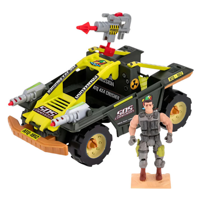 Conjunto Completo: Inclui o carrinho, um boneco de soldado articulado e diversos acessórios como armas, capacetes e outros equipamentos táticos.