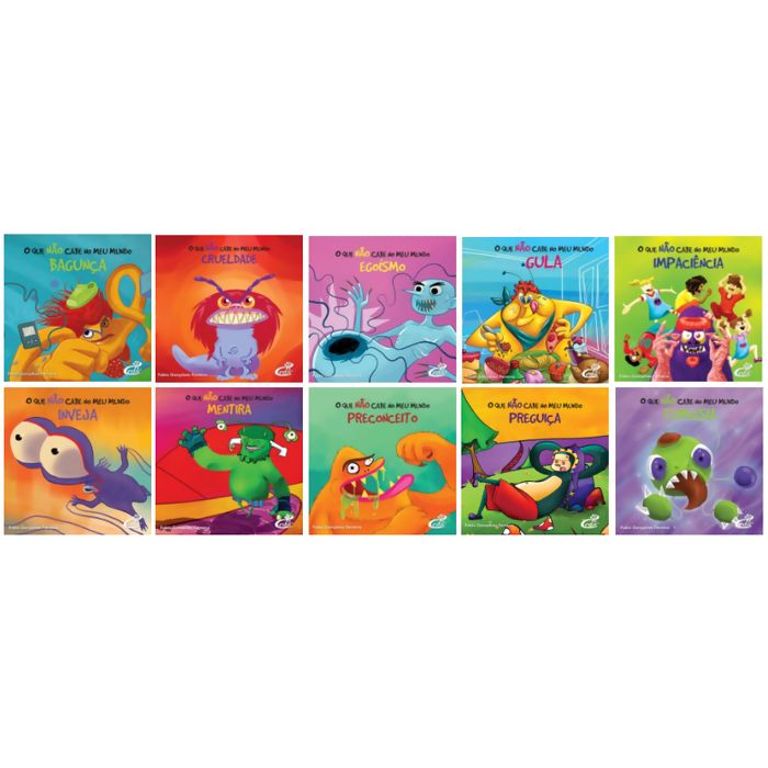 10 livros com histórias de "desvalores": Cada livro aborda um comportamento negativo específico, como a bagunça, a crueldade, o egoísmo, a gula, a impaciência, a inveja, a mentira, o preconceito, a preguiça e a teimosia.