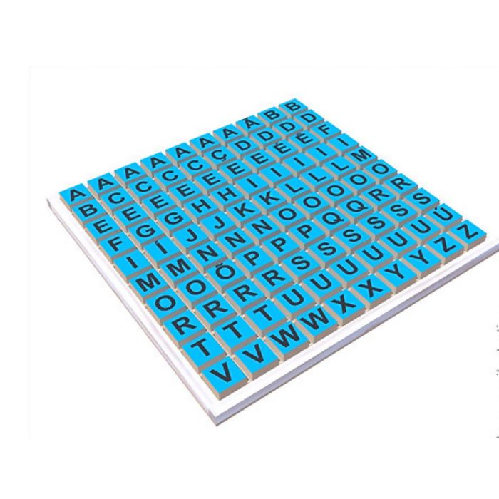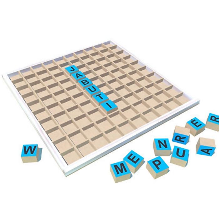 100 cubos em MDF medindo 25mm x 25mm x 18mm cada, com impressão das letras para formar as cruzadas, acondicionados em 01 tabuleiro medindo 320mm x 320mm x 17mm.