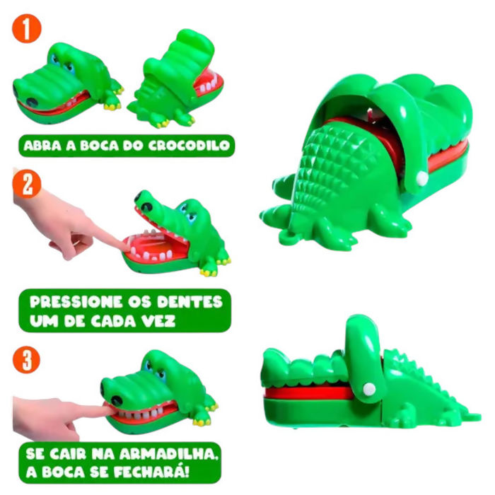 O Jogo do Jacaré é super fácil de jogar. Basta abrir a boca do jacaré e, um por um, os jogadores pressionam um dos seus dentes. A cada rodada, a tensão aumenta, pois apenas um dente aciona a "mordida" do jacaré, pegando o jogador de surpresa. Este brinquedo é ideal para desenvolver a coordenação motora, a destreza manual e a capacidade de reação das crianças de uma forma lúdica e divertida.