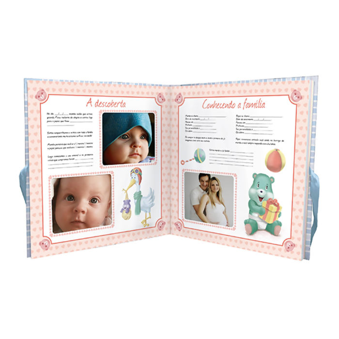 Este livro vem com: suporte, 44 espaços para colocar fotos, página-bolso para guardar lembrancinhas, espaço para escrever e um lindo medidor de altura de pano com local destinado às fotos do bebê.