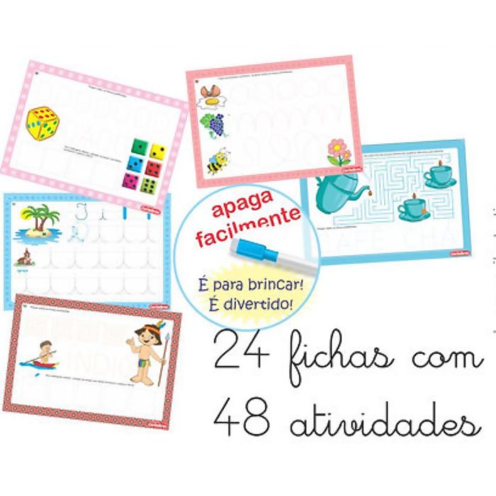 Desenvolve a coordenação motora, reconhecimento das vogais, consoantes e números, auxiliando na alfabetização de forma lúdica através de atividades de desenho, escrita, liga-pontos e outras.